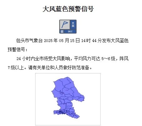 包头市气象台2025年05月15日14时44分发布大风蓝色预警,24小时内全市将受大风影响,平均风力可达5~6级,阵风7级以上。大风天气对于部分行业部门、生产经营单位正常运行和公众生活可能带来影响。包头市安全生产委员会办公室、包头市防灾减灾救灾委员会办公室、包头市森林草原防灭火指挥部办公室、包头市人工影响天气与气象灾害防御指挥部办公室提示: