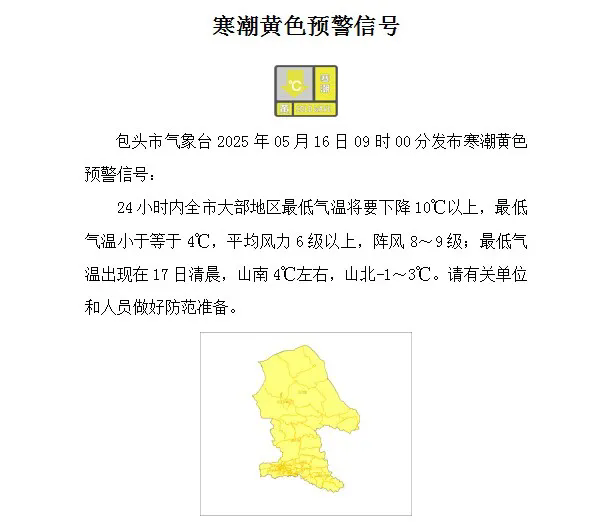 包头市气象台2025年05月16日09时发布寒潮黄色预警,24小时内全市大部地区最低气温将要下降10℃以上,最低气温小于等于4℃,平均风力6级以上,阵风8~9级;最低气温出现在17日清晨,山南4℃左右,山北-1~3℃。此次寒潮过程对于部分行业部门、生产经营单位正常运行和公众生活可能带来较为严重的影响。包头市安全生产委员会办公室、包头市防灾减灾救灾委员会办公室、包头市人工影响天气与气象灾害防御指挥部办公室提示:
