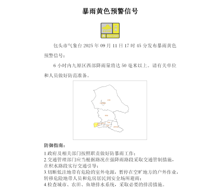 包头市气象台2025年09月11日17时45分发布暴雨黄色预警,6小时内九原区西部降雨量将达50毫米以上。降雨过程对于部分行业部门、生产经营单位正常运行和公众生活可能带来影响。包头市安全生产委员会办公室、包头市防灾减灾救灾委员会办公室: