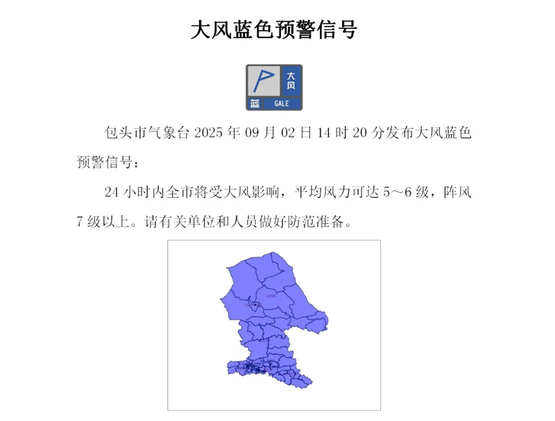 包头市气象台2025年09月02日14时20分发布大风蓝色预警,24小时内全市将受大风影响,平均风力可达5~6级,阵风7级以上。大风天气对于部分行业部门、生产经营单位正常运行和公众生活可能带来影响。包头市安全生产委员会办公室、包头市防灾减灾救灾委员会办公室: