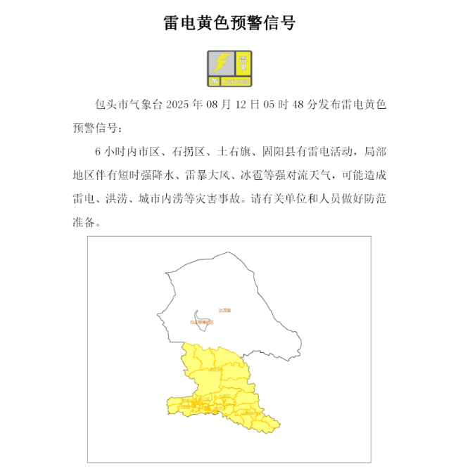 包头市气象台2025年08月12日05时48分发布雷电黄色预警信号:6小时内市区、石拐区、土右旗、固阳县有雷电活动,局部地区伴有短时强降水、雷暴大风、冰雹等强对流天气,可能造成雷电、洪涝、城市内涝等灾害事故。雷电对于部分行业部门、生产经营单位正常运行和公众生活可能带来影响。包头市安全生产委员会办公室、包头市防灾减灾救灾委员会办公室提示: