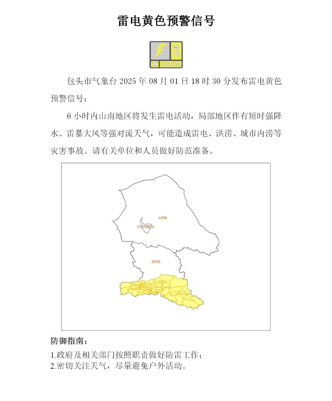 包头市气象台2025年08月01日18时30分发布雷电黄色预警,6小时内山南地区将发生雷电活动,局部地区伴有短时强降水、雷暴大风等强对流天气,可能造成雷电、洪涝、城市内涝等灾害事故。雷电对于部分行业部门、生产经营单位正常运行和公众生活可能带来影响。包头市安全生产委员会办公室、包头市防灾减灾救灾委员会办公室提示: