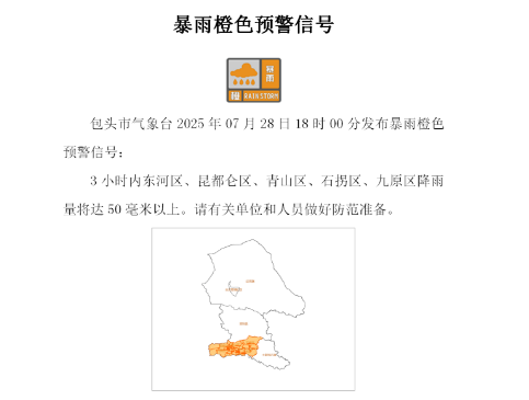 包头市气象台2025年07月28日18时发布暴雨橙色预警,3小时内东河区、昆都仑区、青山区、石拐区、九原区等地降雨量将达50毫米以上。降雨过程对于部分行业部门、生产经营单位正常运行和公众生活可能带来影响。包头市安全生产委员会办公室、包头市防灾减灾救灾委员会办公室: