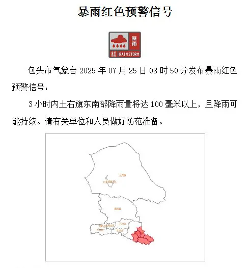 包头市气象台2025年07月25日08时50分发布暴雨红色预警,3小时内土右旗东南部降雨量将达100毫米以上,且降雨可能持续。包头市安全生产委员会办公室、包头市防灾减灾救灾委员会办公室: