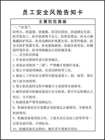 明确了每一个岗位存在的各类安全风险、主要防范措施及应急措施。让每一员工及时避免自己暴露在风险中。
