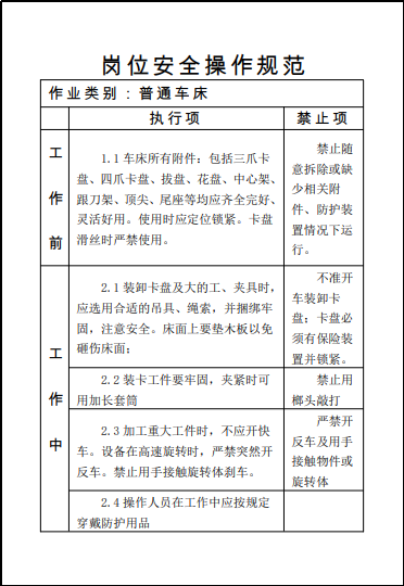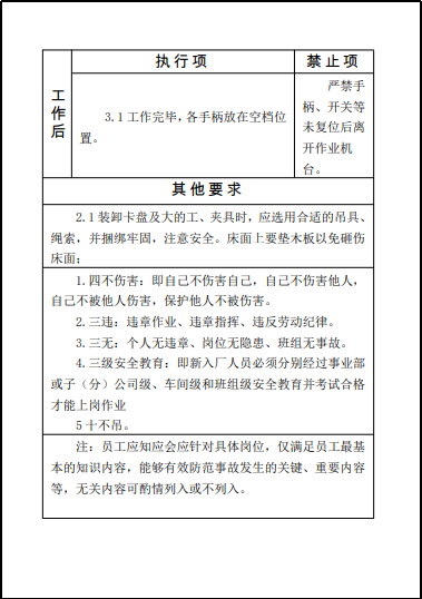 依据《安全技术、职业健康操作规程》、《设备安全操作规程》等内容,明确工作前、中、后分别应落实的检查及固定动作要求,严格、准确执行每一项操作规程。
