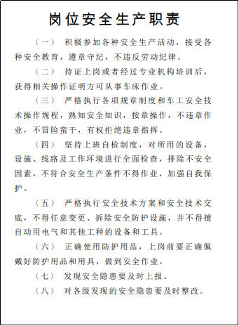 落实全员安全生产责任制,明确每一名员工的岗位安全生产职责,让每一位员工知晓自己的安全生产工作职责。